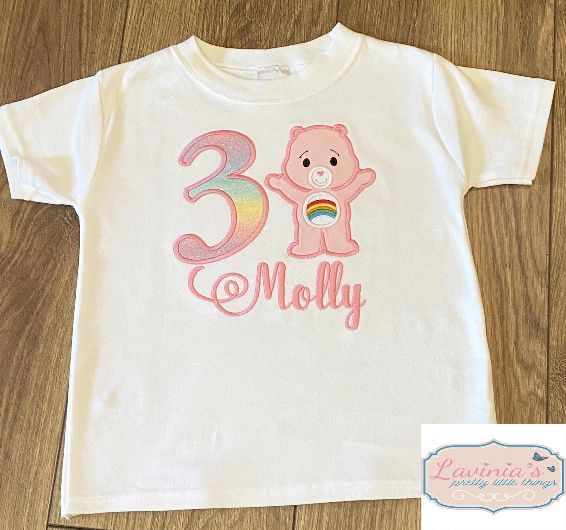 Really Cute Rainbow Bear design Birthday number t-shirt, Girls or Boys personalised custom made top, this is embroidered
