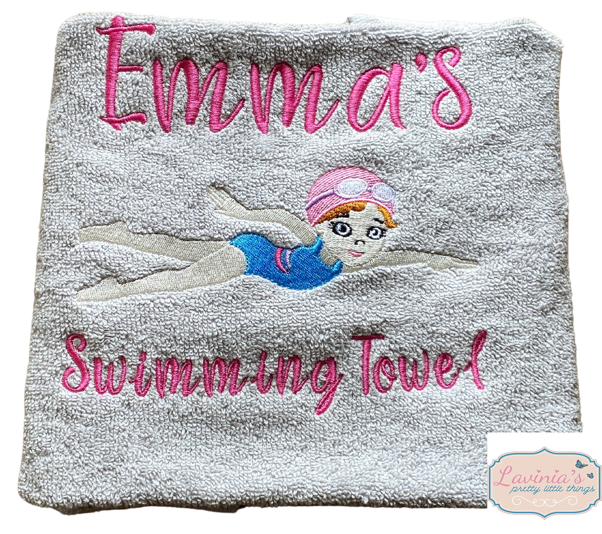 Children‘s Embroidered swimming towel with Girl swimmer design and personalised with name