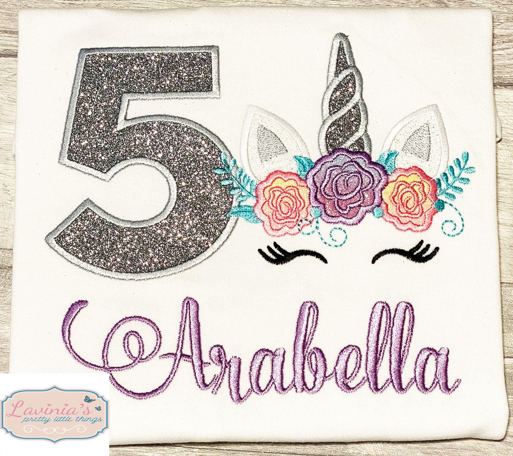 Cute Glitter Unicorn design Birthday number t-shirt, Girls personalised custom made top, this is made with Silver glitter vinyl and embroidered.