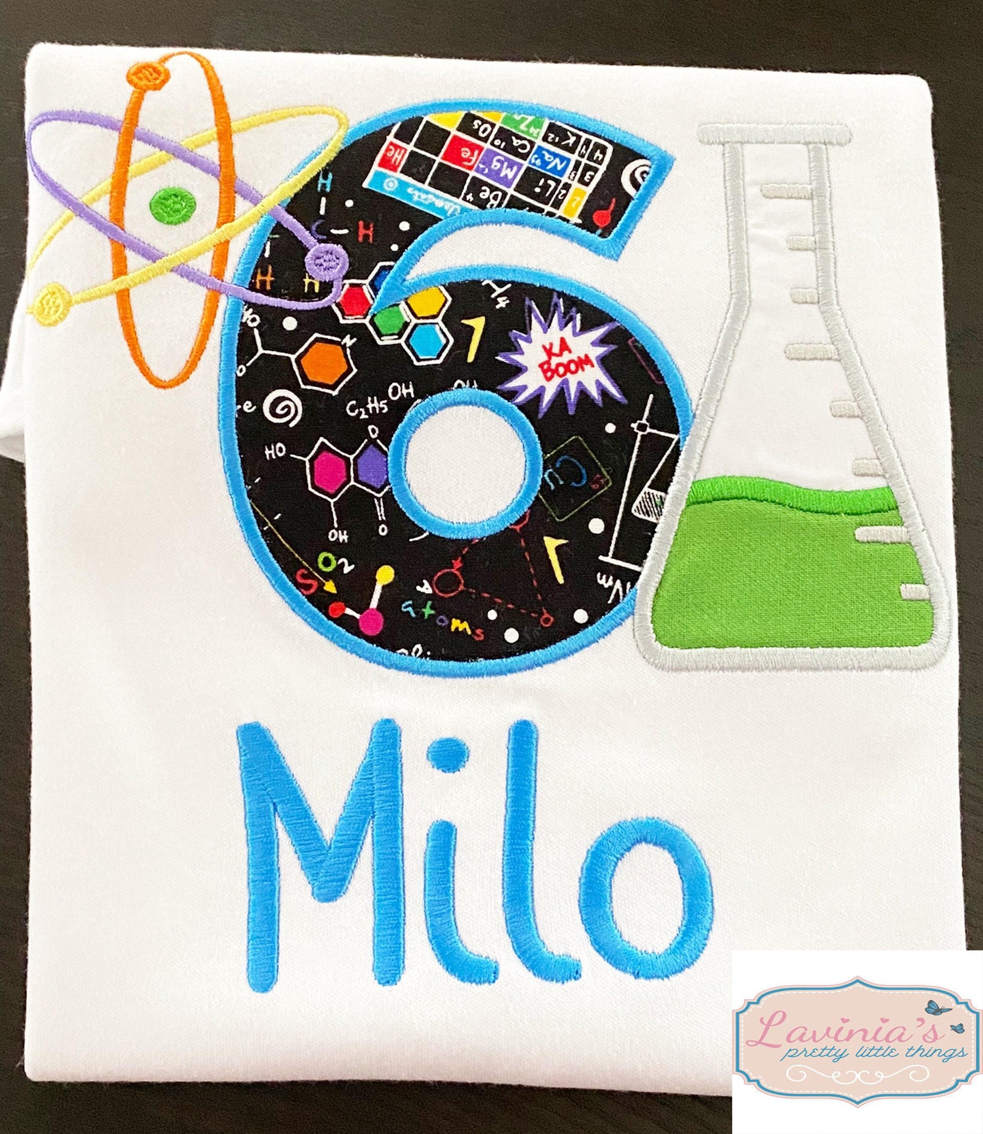 Cute Science design Birthday number t-shirt, Boys personalised custom made top, this is embroidered with fabric